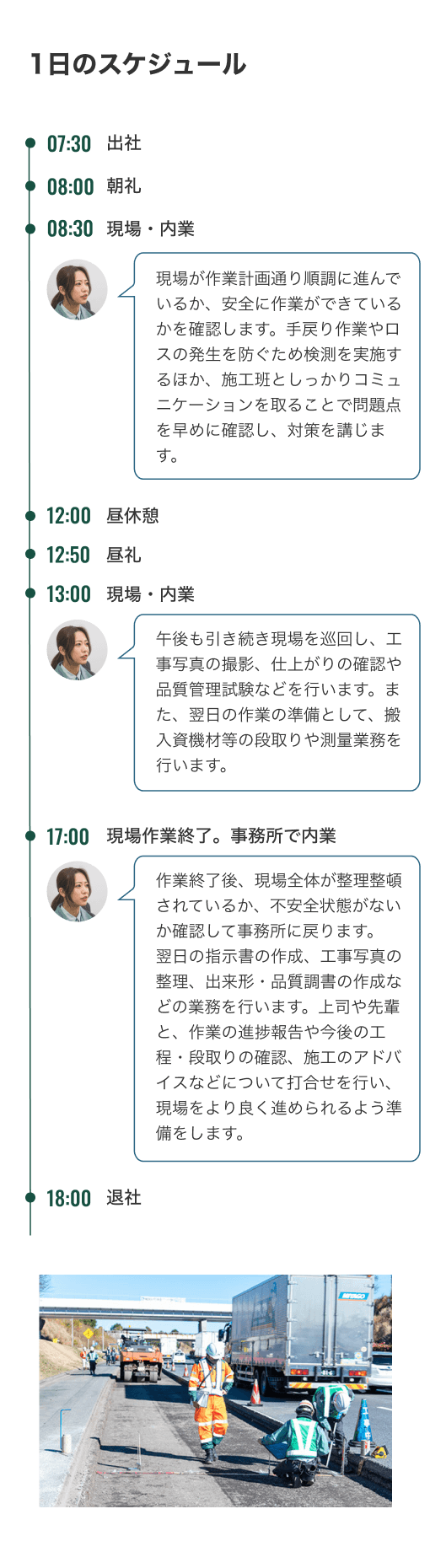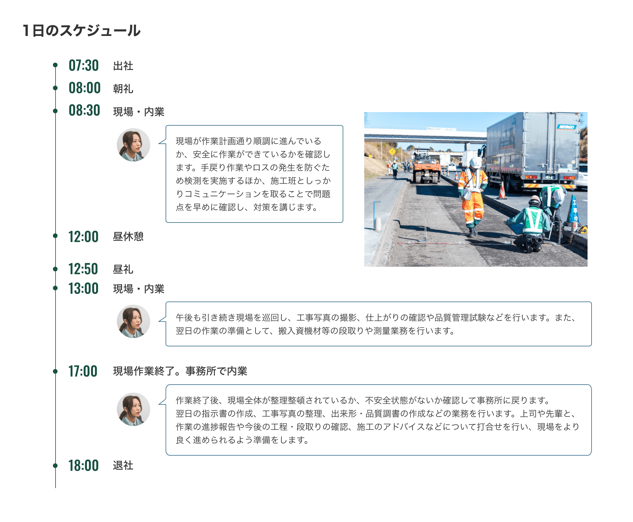 NIPPOで働いていると、日々の業務を通じて社会貢献を強く実感します。特に印象に残っているのは、国交省の新設道路工事に携わった時ですね。 自分がこの間まで工事で歩いていた道を、一般の車両が走っている姿を見た時は感動しました。新しいインフラを創り出す一員であることへの誇りを、強く感じる瞬間でした。 今後は先輩方から学んだことを活かしながら、上からも下からも信頼される現場代理人を目指したいですね。一級土木施工管理技士の資格を取得して、任された現場で全力を尽くす。そんな姿勢を大切に、これからも一つひとつの仕事に全身全霊で取り組んでいきたいと思います!