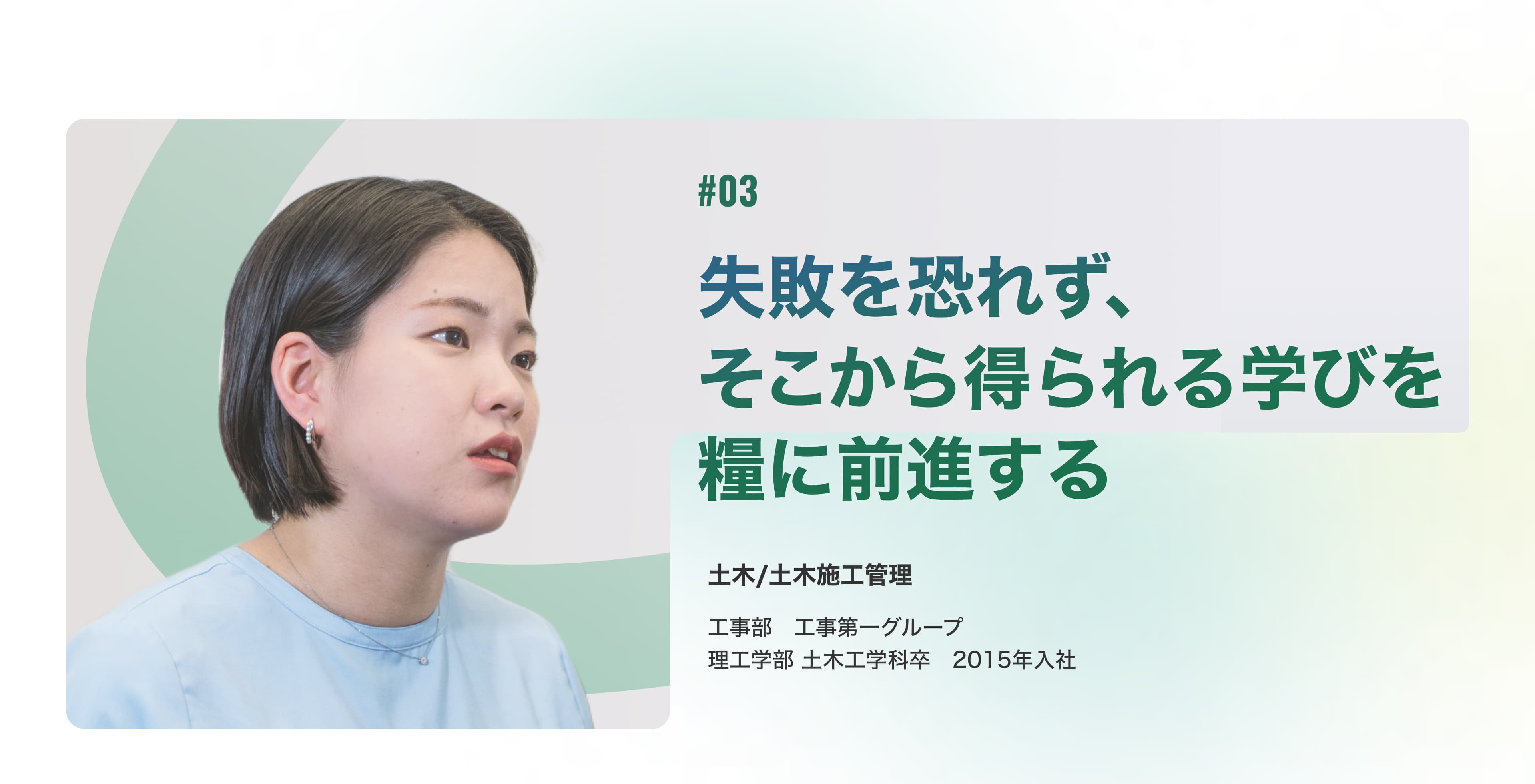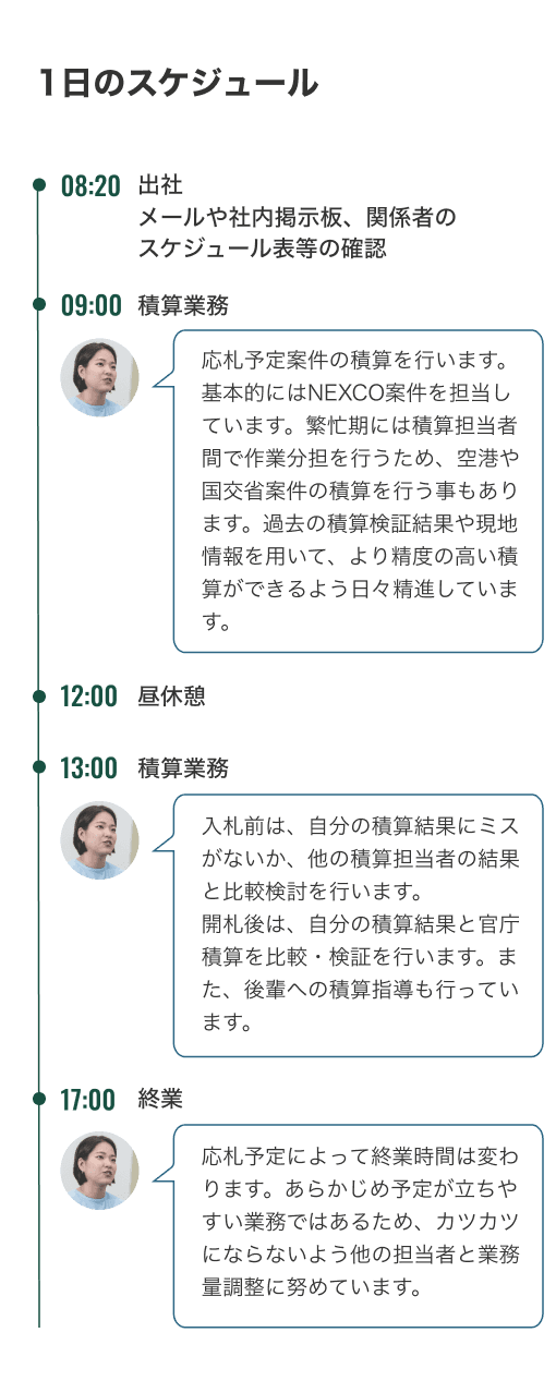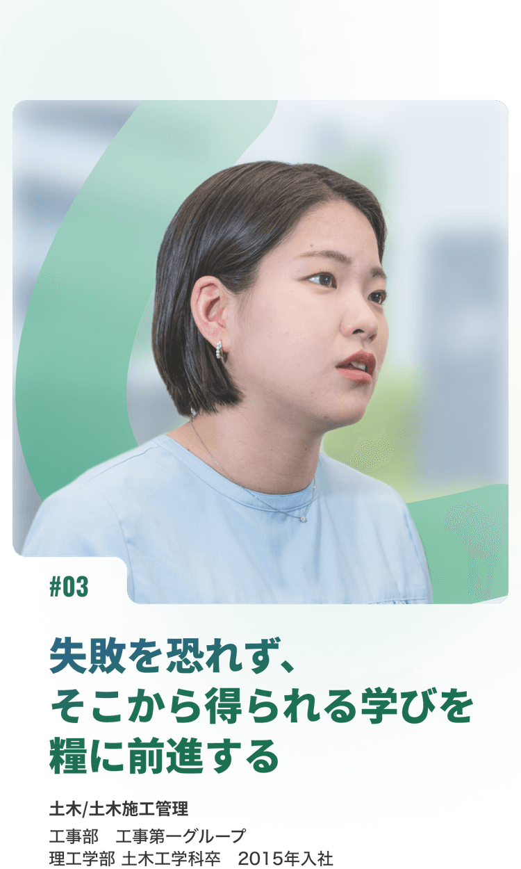 土木の売上高が業界トップクラスであることを四季報で知り、NIPPOに興味を持ちました。規模が大きいわりには知名度が高くなく、専業No.1というプライドを感じる一方で偉ぶらない、そんなちょっと変わった雰囲気に惹かれて入社を決めました。 入社後は、思っていたよりも自由度の高い環境に驚きました。ゴールさえブレなければ、変にやり方にこだわらず「できるなら挑戦してみていいんじゃない」と背中を押してくれる雰囲気があります。 私はこれしかだめ!と言われるのは苦手なので(笑)自分で考えて行動するのが好きな私には、とてもフィットする社風だと感じています。
