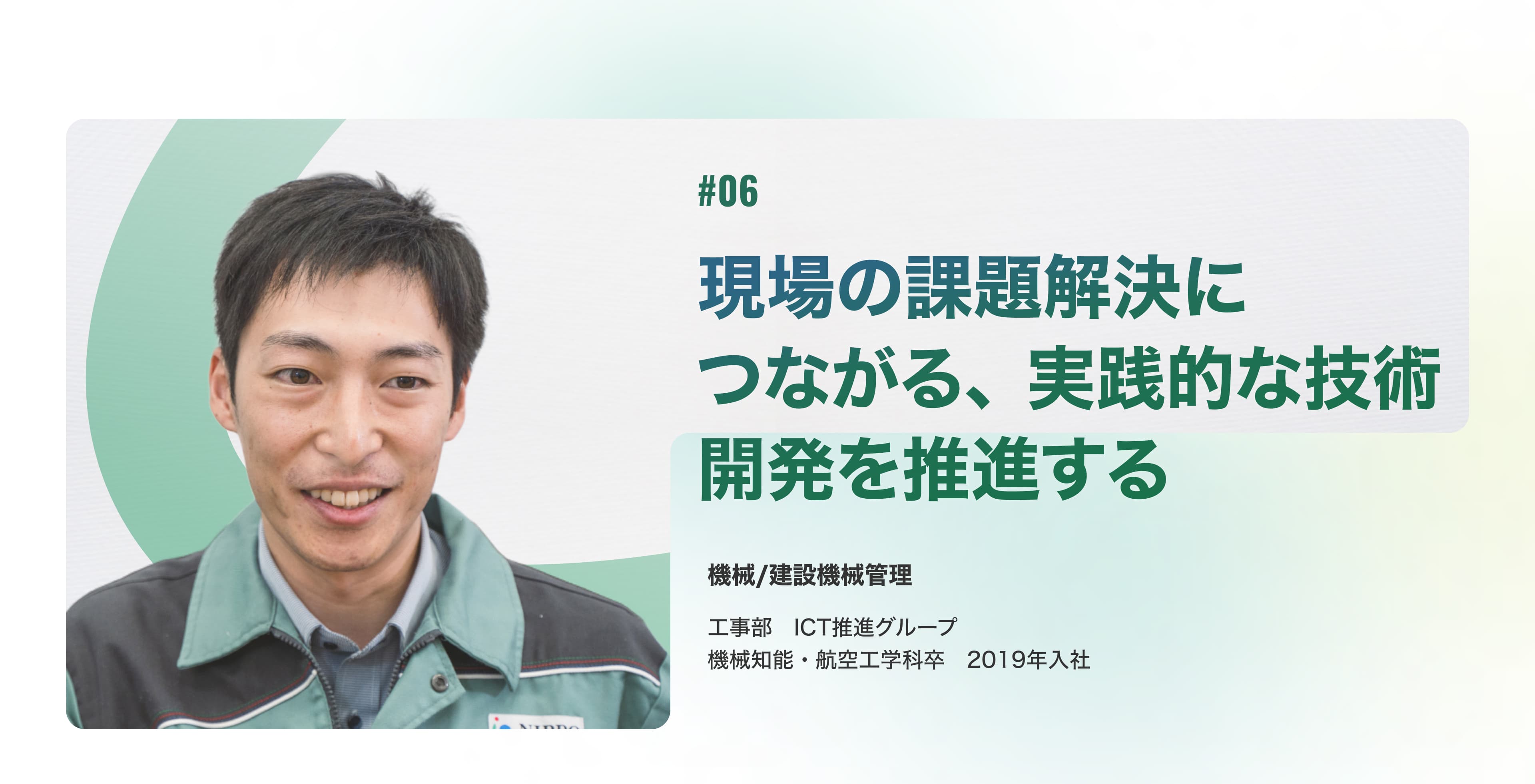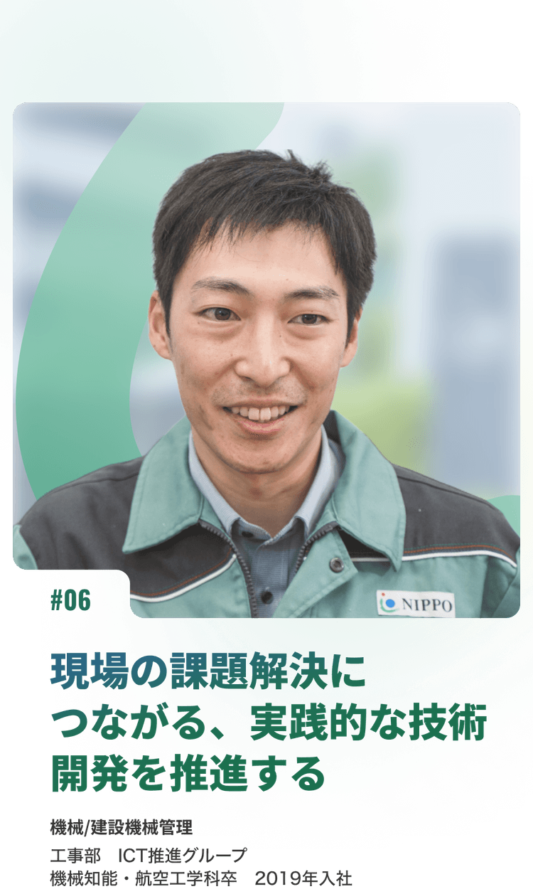 大学の先輩がエンジニアリング部に在籍していたのがきっかけで NIPPOを知りました。就活では自動車関連のメーカーも視野に入れていましたが、NIPPOなら部品ではなく機械全体に携われるので、入社を決めました。インフラを支える道路建設は無くなることのない事業ですし、業界トップのNIPPOには安定性もあるかなと。 また、業界トップだからこそ、新しい機械の開発に携われるのが魅力ですね。最新のセンサーやICT、IoTを活用して、業務効率化や安全性向上に取り組むのもやりがいがあります。展示会で得た知識を活かして、他分野の技術を建設機械に応用するような共同研究にも参加できるのはNIPPOならではだと思いますよ。