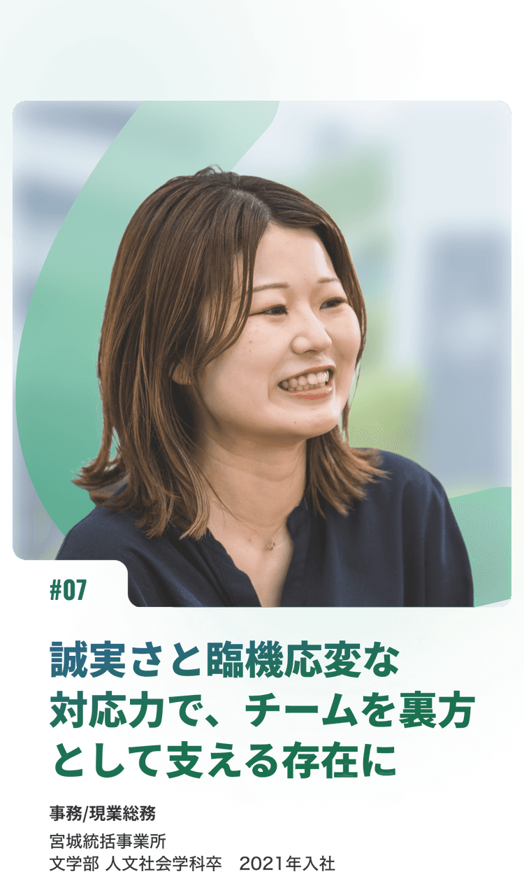 とにかく人から頼られる機会が多いので、わからないことはきちんと調べてから答えるといった誠実性を大切にしています。大学時代のマネージャー経験が、今の仕事に繋がっているなと実感しますね。チームを裏方として支える臨機応変な対応力が活きる場面が多いです。 将来的に部下ができたら、コミュニケーションを大切にする組織づくりを目指していきたいです。現場の声に真摯に耳を傾け、一人ひとりが能力を存分に発揮できる。風通しの良い組織づくりを目指していきたいですね。誰もが生き生きと働ける環境を、事務の立場からサポートしていくのが私の夢です。