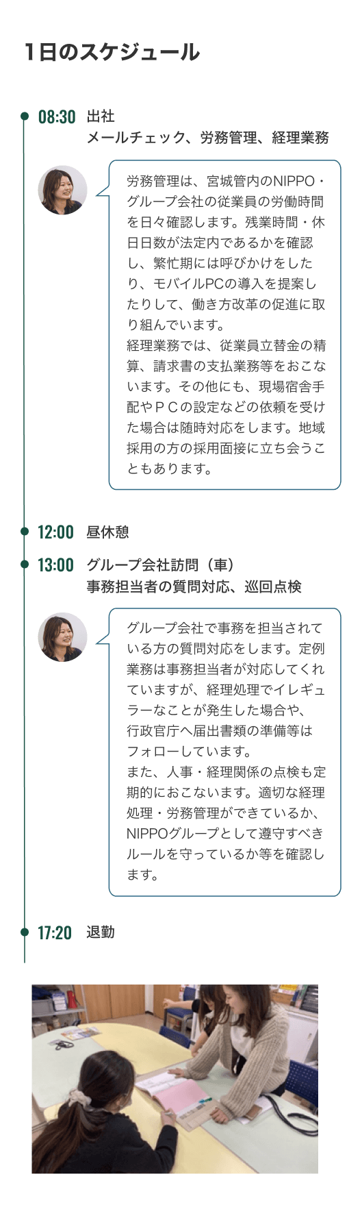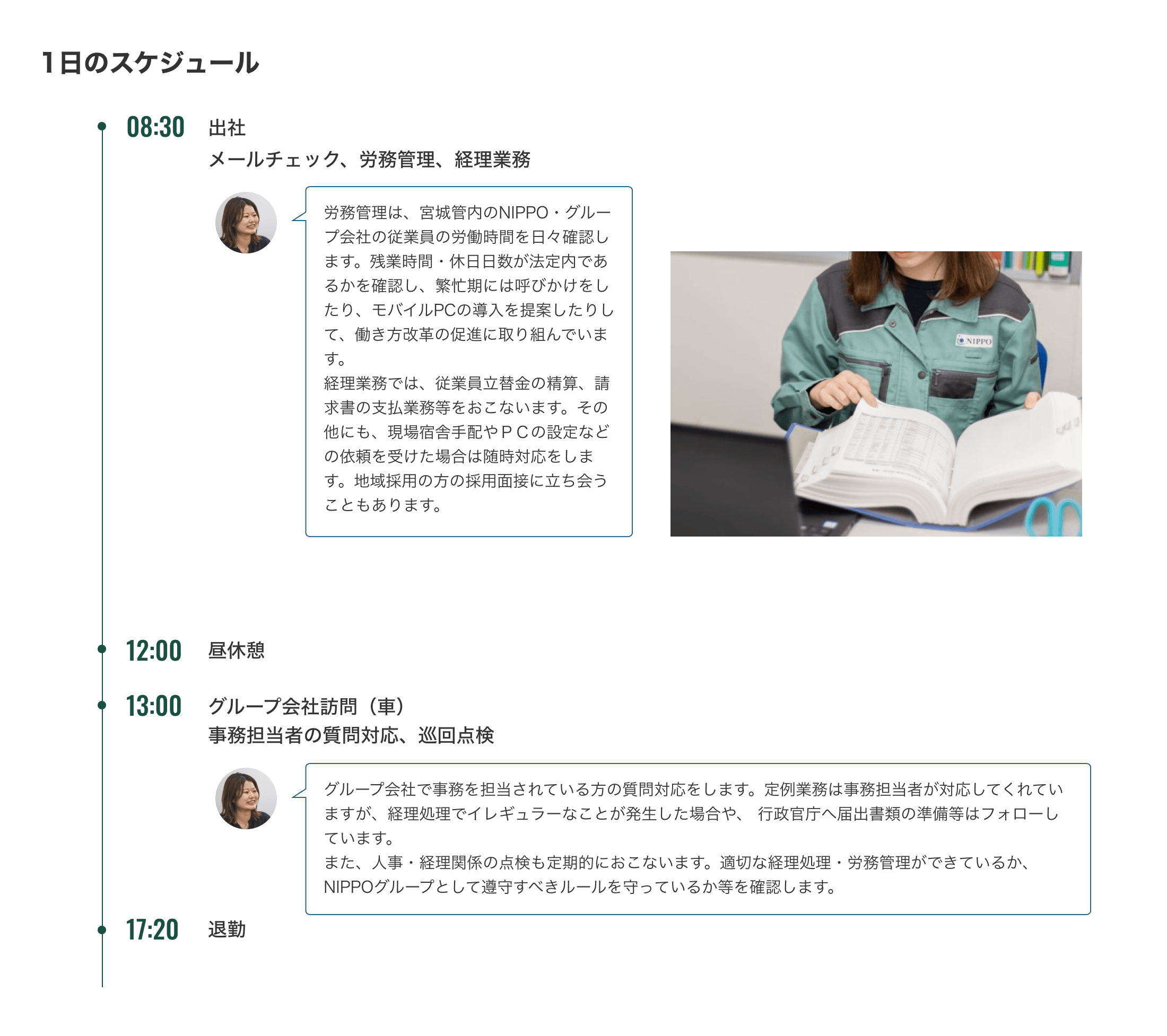 私が好きなNIPPOの特徴は、何といっても人と仕事の幅広さです。様々な現場で多様な業務を経験できるので、成長の機会に恵まれていると感じます。また、福利厚生も充実しており、地方と都市部で待遇に差がないのも魅力ですね。 働く人も本当に温かくて頼りになる人ばかりですし、周りの方が自分のことを頼ってくれると嬉しいです。福島の現場から異動する際は、現地採用の社員の方々が別れを惜しんでくれたことが心に残っています。今でも連絡を取り合い、分からないことがあれば頼ってくれる関係性は、仕事冥利に尽きる思い出です。現場を支える中で築いた、人との絆が何よりの宝物だと感じています。